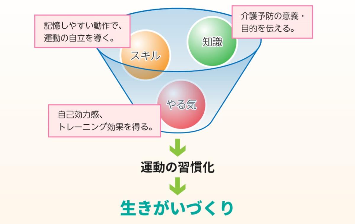 3つのレベルを利用者様の状況に合わせて、らせん状に高めていきます。“運動の習慣化”から“生きがいづくり”につなげ、「生涯健康・生涯現役」をめざします。