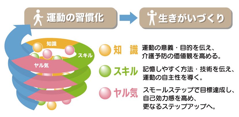 「スキル・知識・ヤル気」の 3 要素を参加者の状況に応じて、らせん状に高めていきます。“運動の習慣化” から “生きがいづくり” に繋げ、「生涯健康・生涯現役」をめざします。