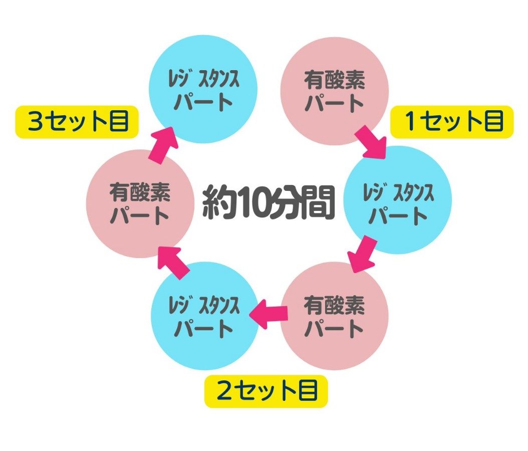サーキット形式は、有酸素パート2分とレジスタンスパート1分を交互に3セットの計約10分が基本。さらにクラス形式は対象者・目的に合わせて、カスタマイズ可能。