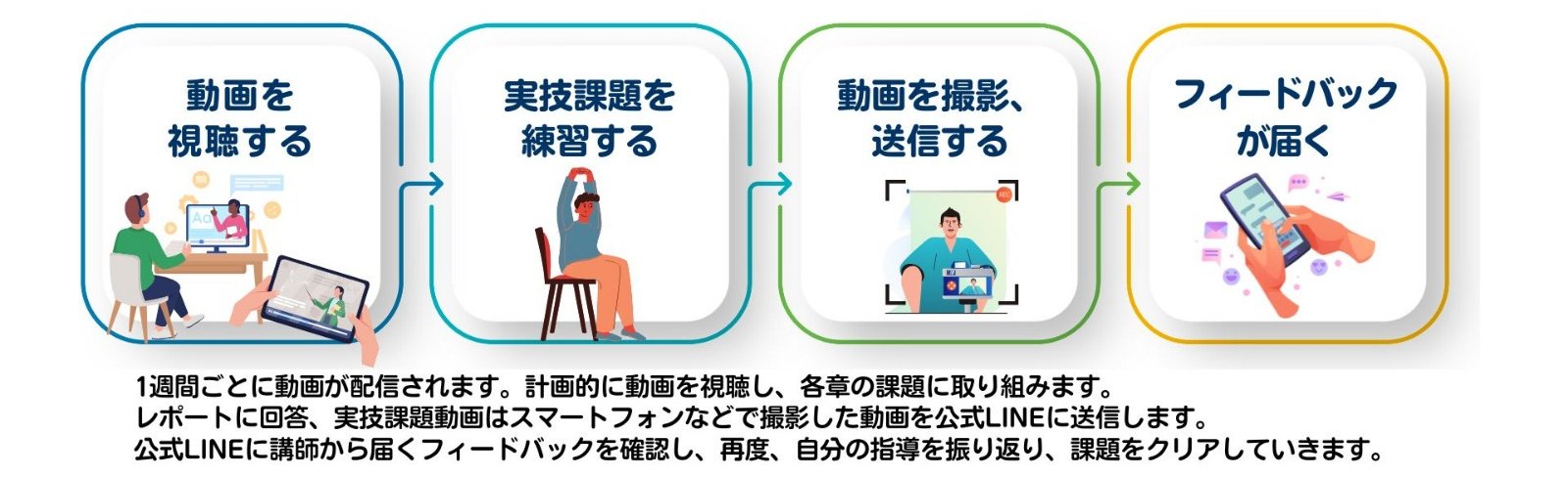 【内容】サーキットチェア基礎理論/健康体力づくり概論/実技体験/指導法解説/指導法実演/レポート・動画提出/修了確認/修了式