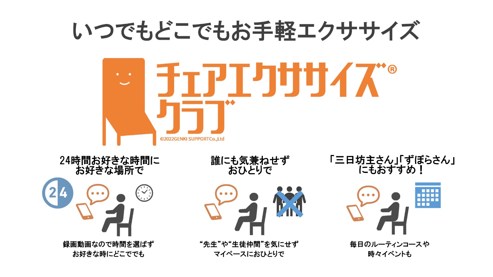 チェアエクササイズ®クラブはメンバー限定のオンライン動画配信サイトです。安全で効果的、良質なエクササイズの数々を無制限で視聴できます。