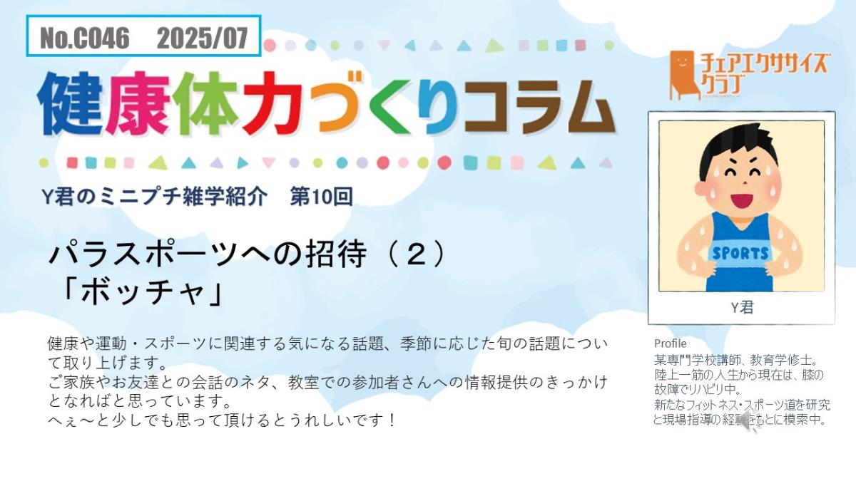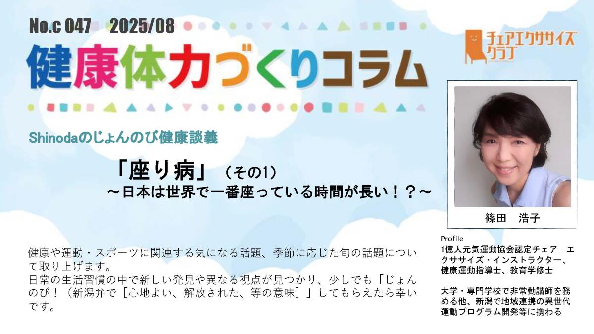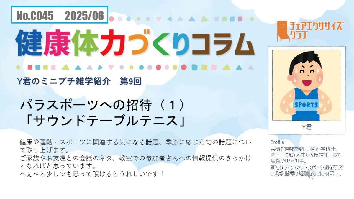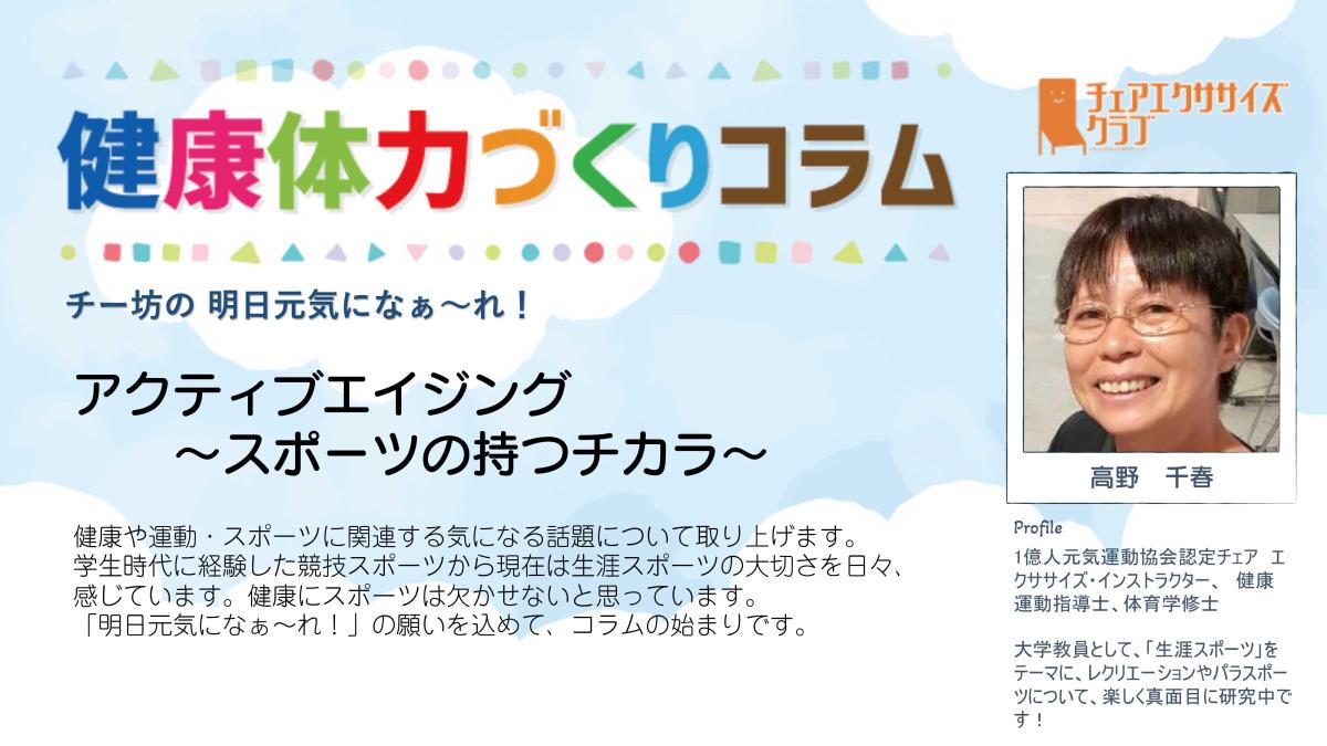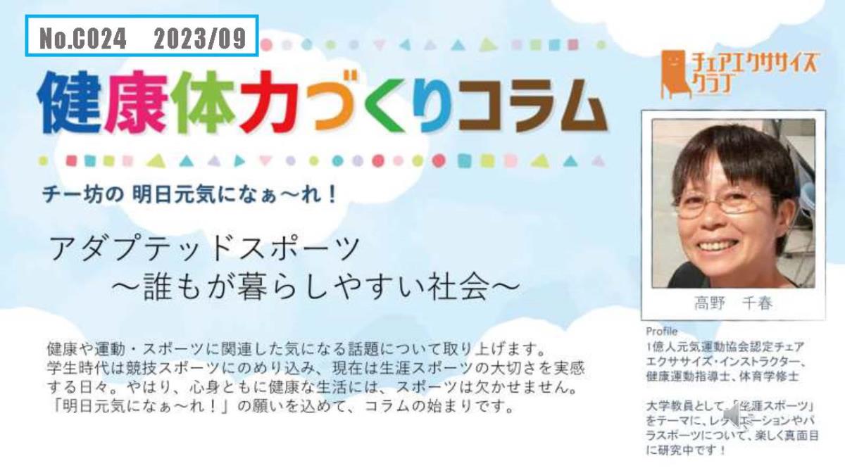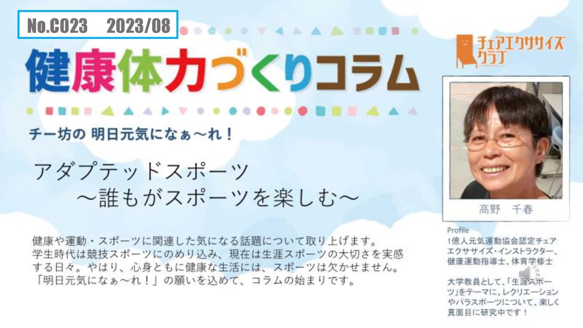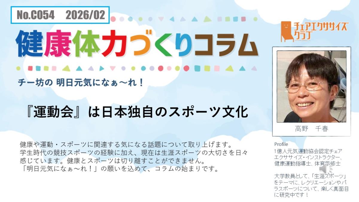 チェアエクササイズクラブでは、健康づくり、体力づくりに役立つ情報をコラムとして発信しています。各講師の専門分野から、様々なコラムを毎月1本ずつ「動画で観るコラム」とその資料をアップしています。