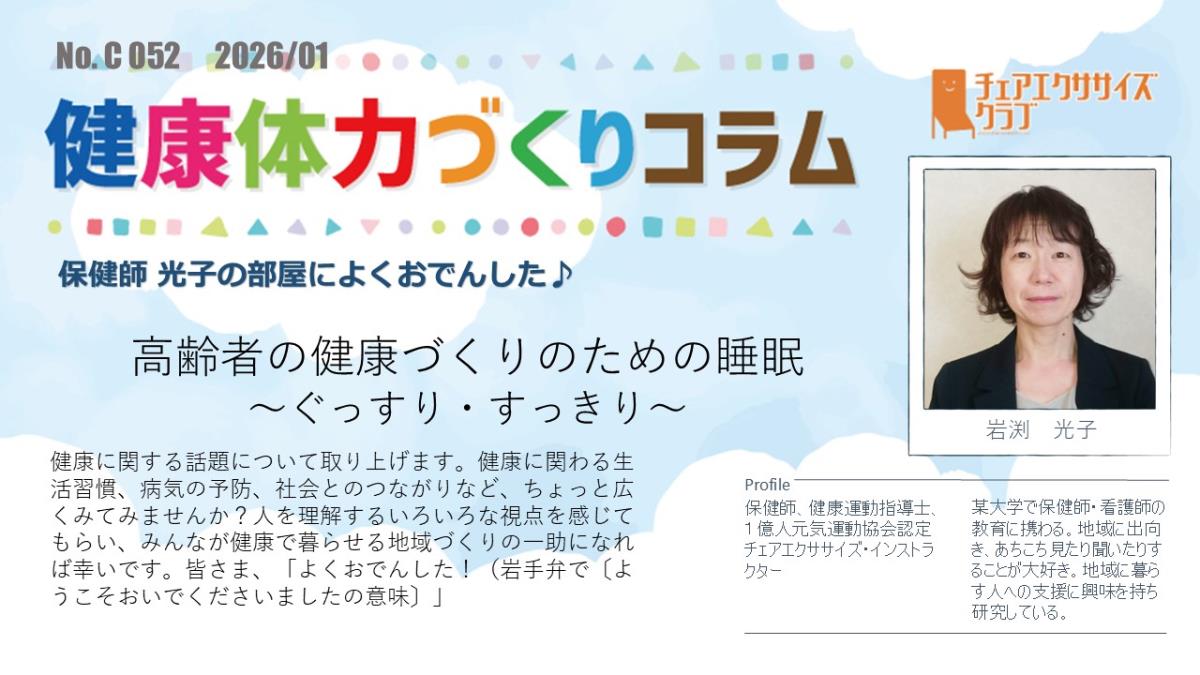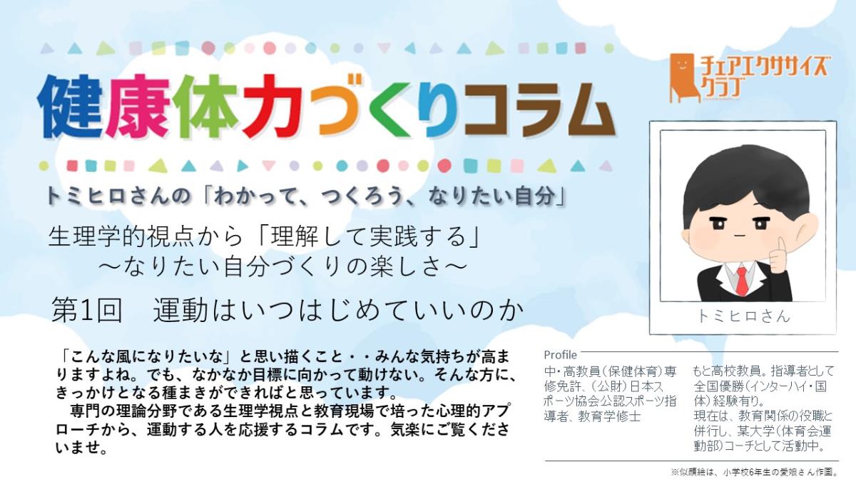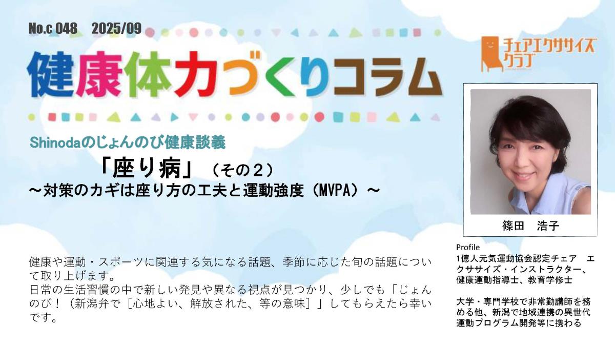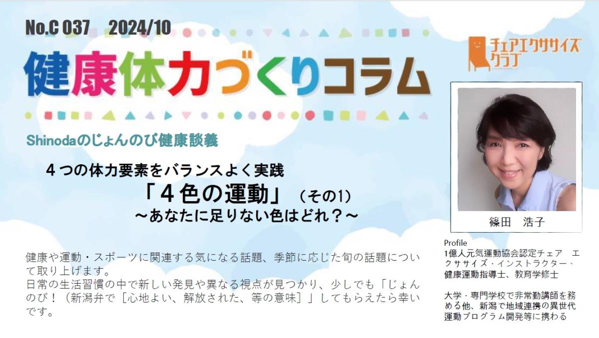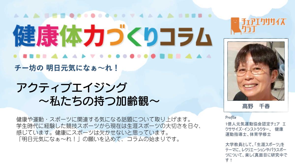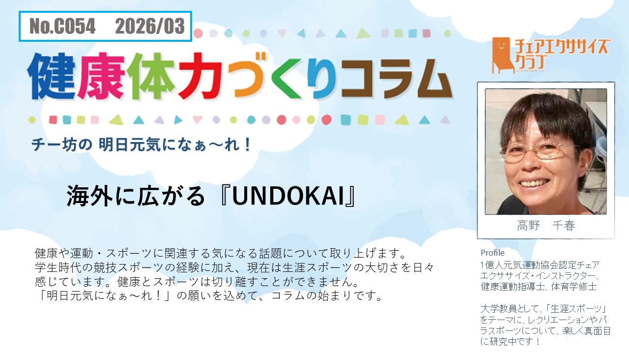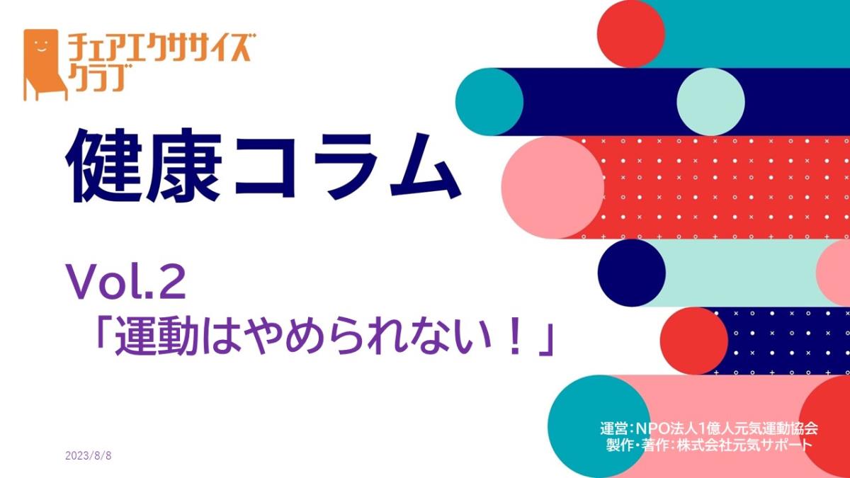 チェアエクササイズクラブでは、健康づくり、体力づくりに役立つ情報をコラムとして発信しています。各講師の専門分野から、様々なコラムを毎月1本ずつ「動画で観るコラム」とその資料をアップしています。