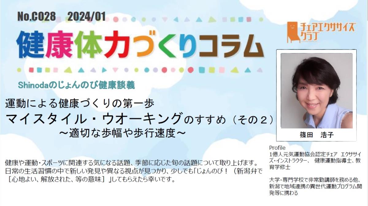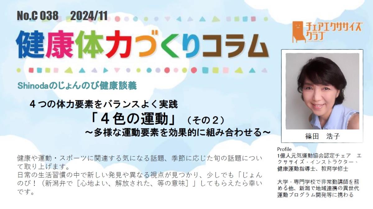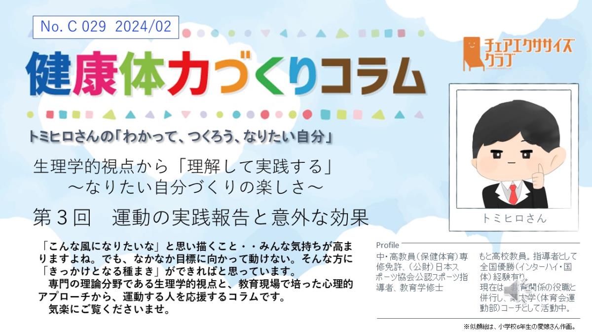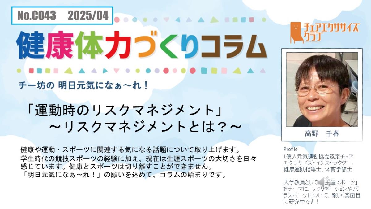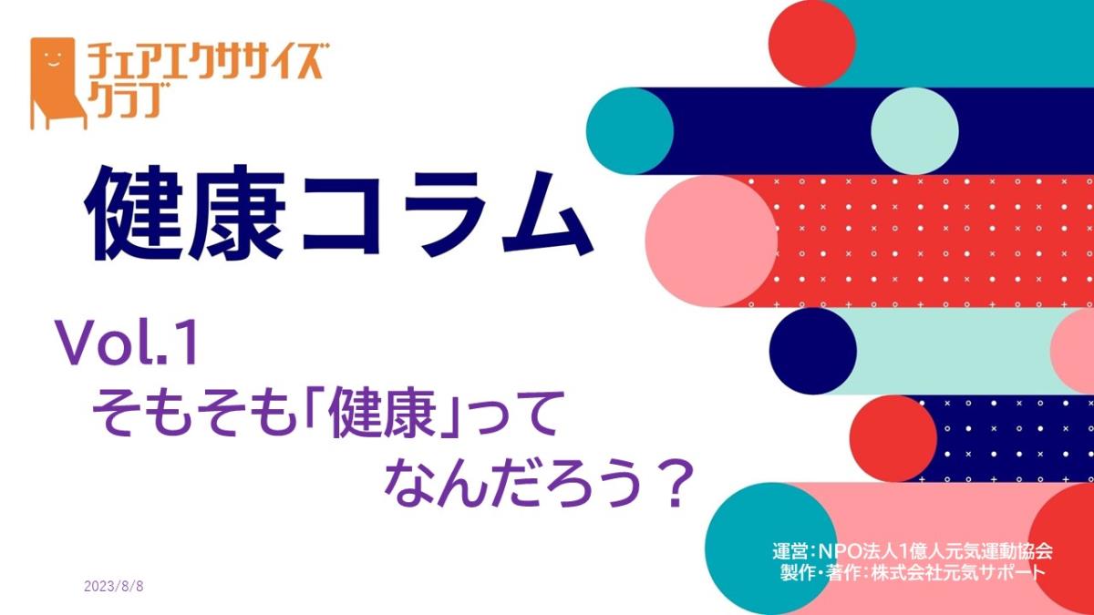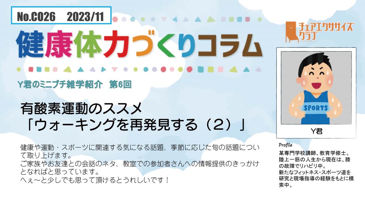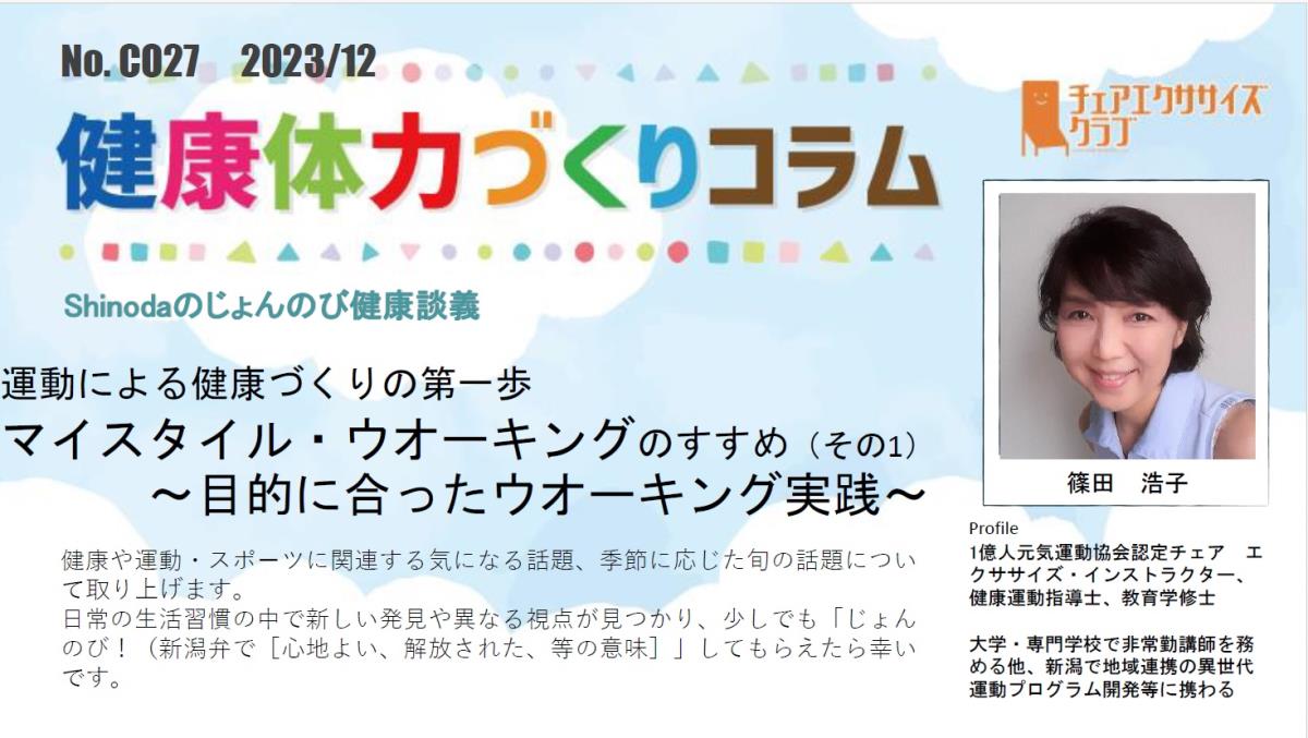 チェアエクササイズクラブでは、健康づくり、体力づくりに役立つ情報をコラムとして発信しています。各講師の専門分野から、様々なコラムを毎月1本ずつ「動画で観るコラム」とその資料をアップしています。