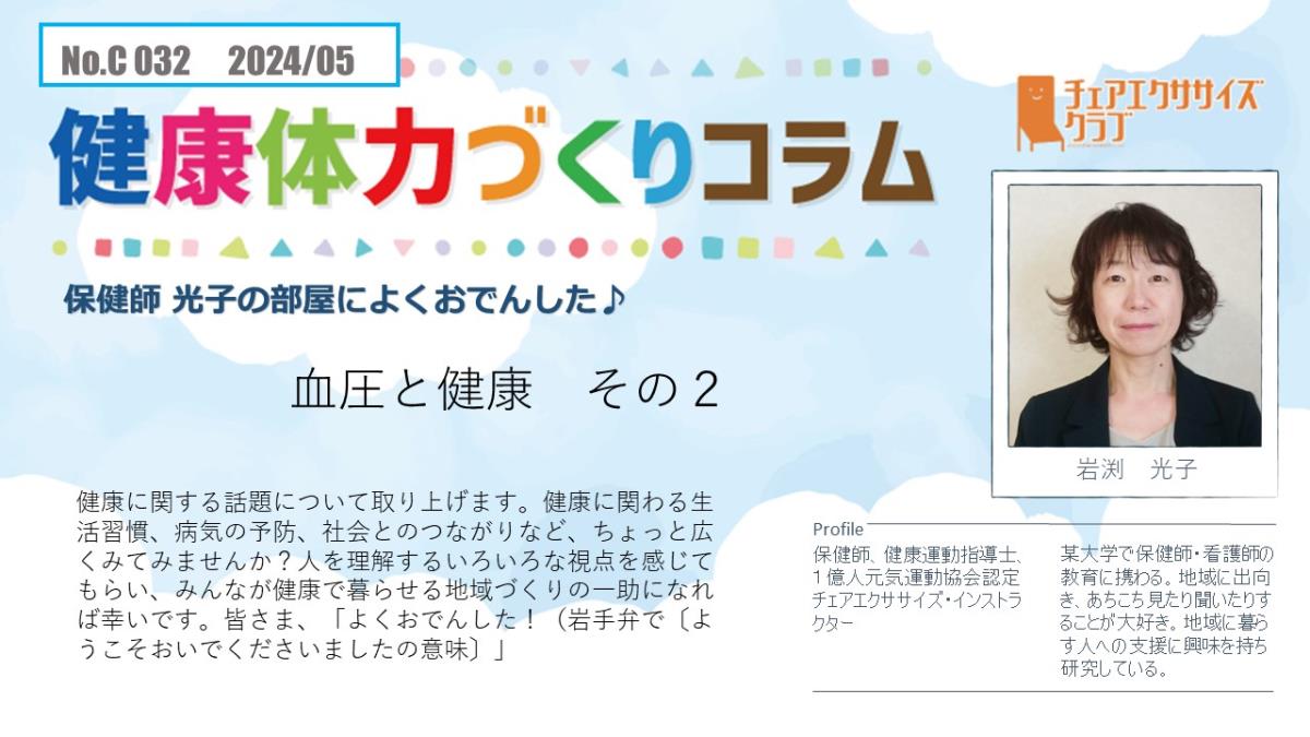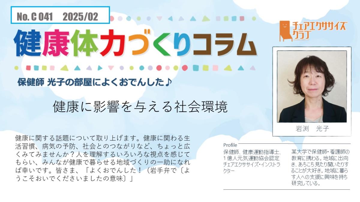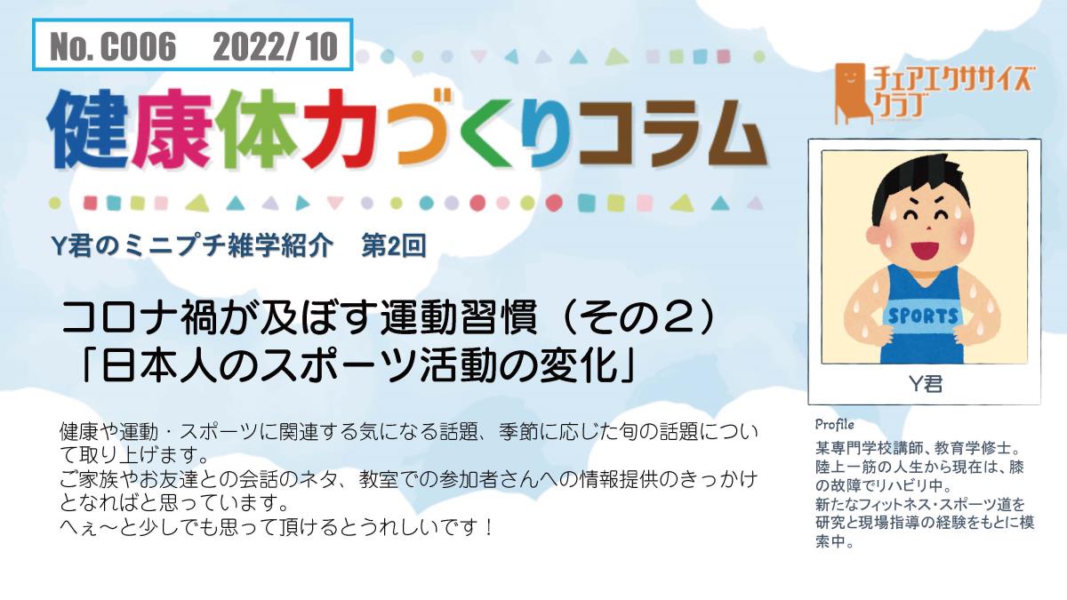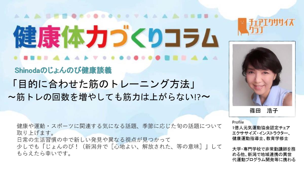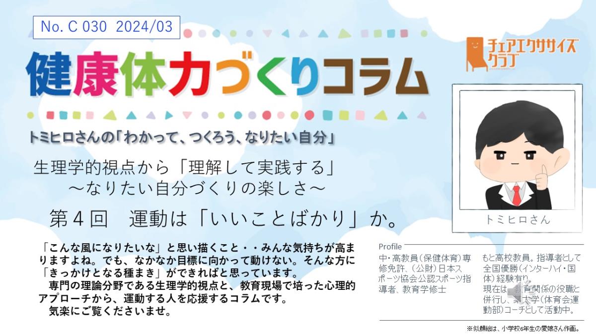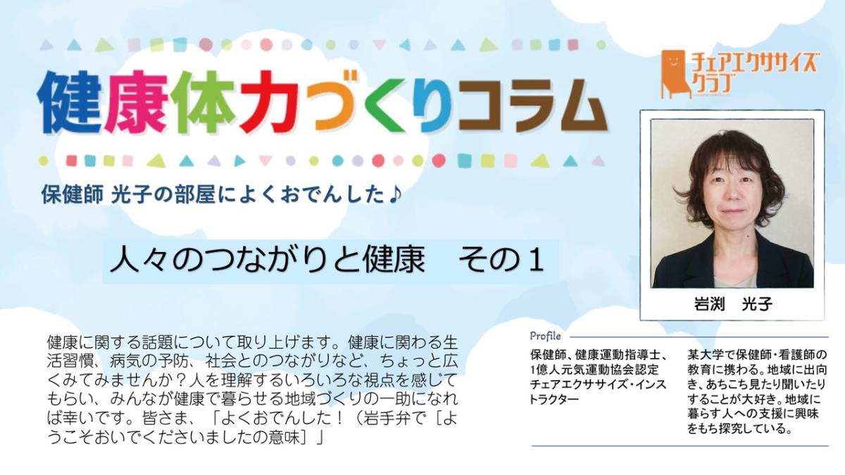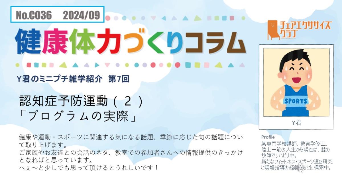 チェアエクササイズクラブでは、健康づくり、体力づくりに役立つ情報をコラムとして発信しています。各講師の専門分野から、様々なコラムを毎月1本ずつ「動画で観るコラム」とその資料をアップしています。
