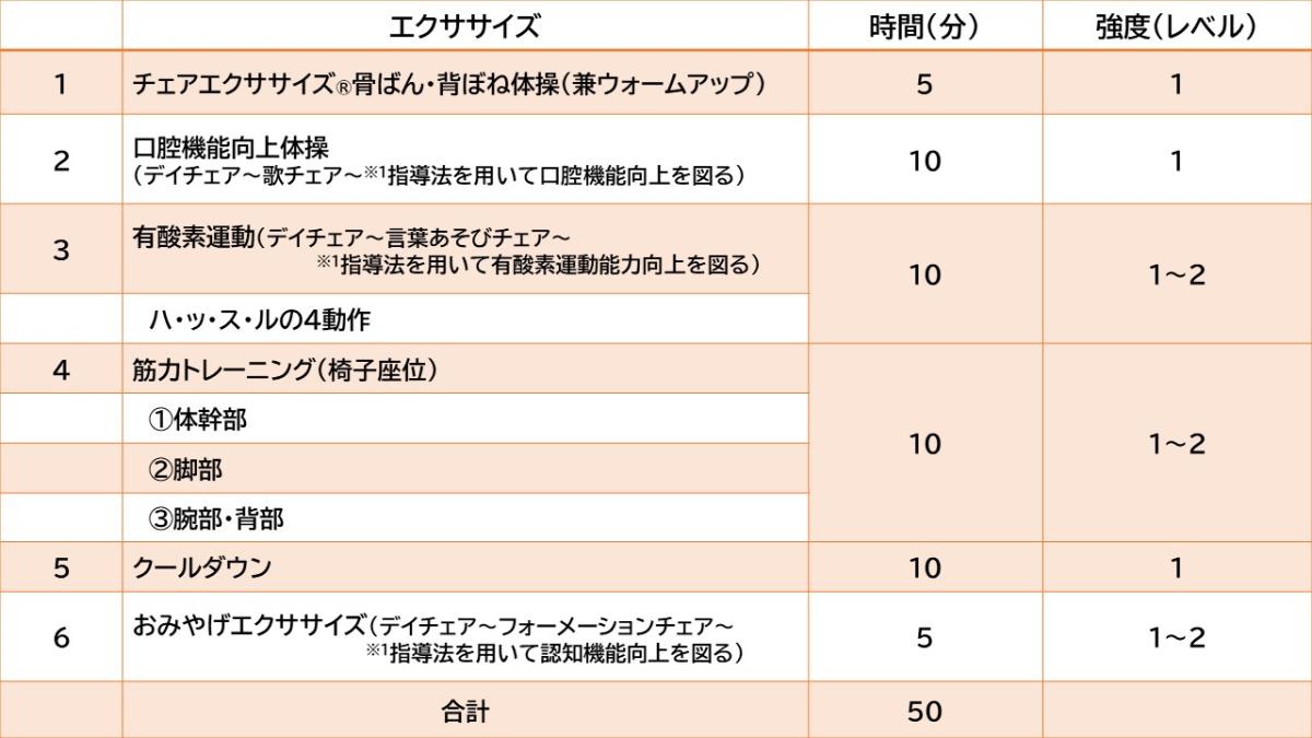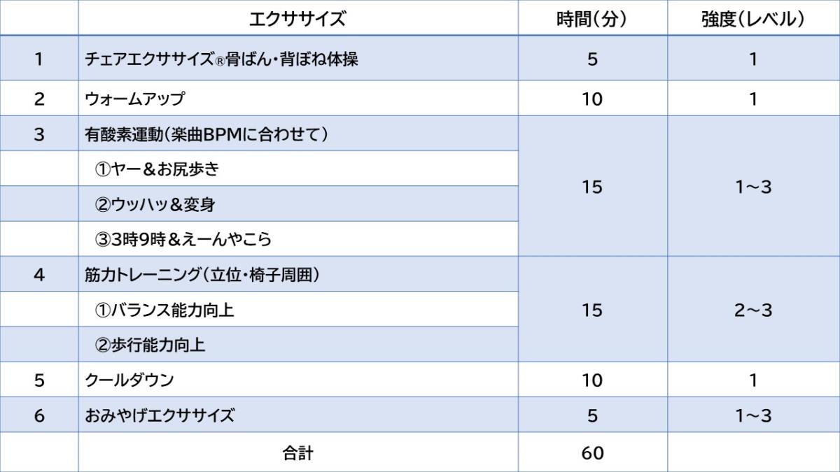 記憶しやすい動作で構成されているので、運動初心者や低体力な高齢者でも楽しく継続ができます。継続することで、自分の変化(主観的・客観的トレーニング効果)を感じ、自己効力感につなげ、運動の習慣化から生きがいづくりに発展します。