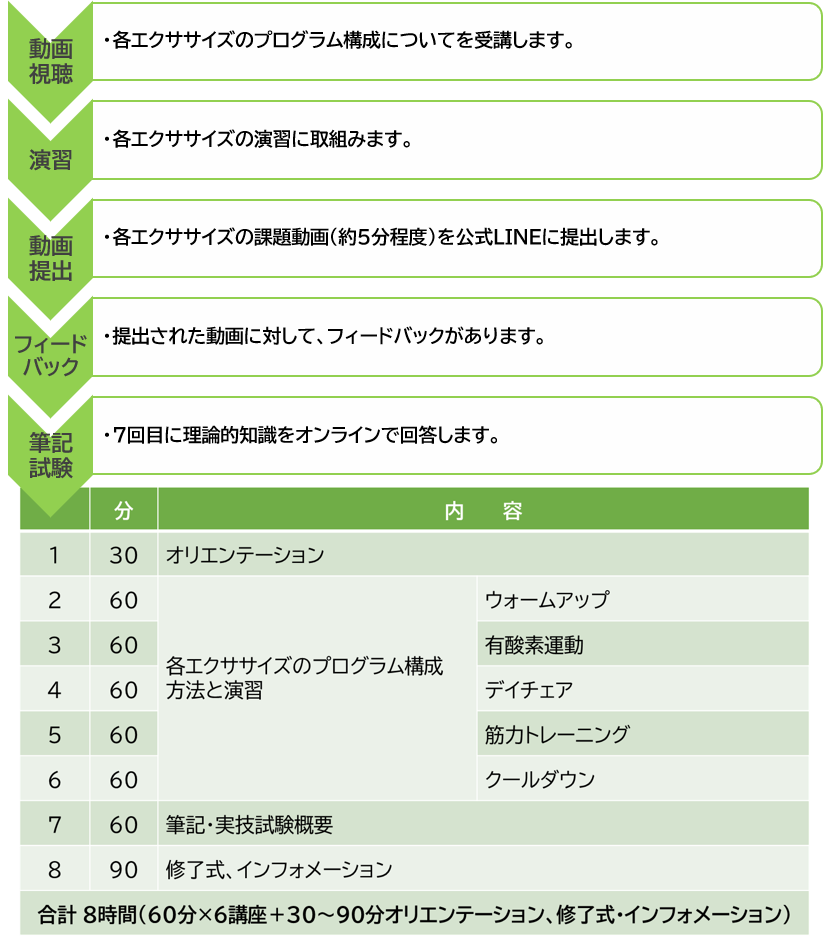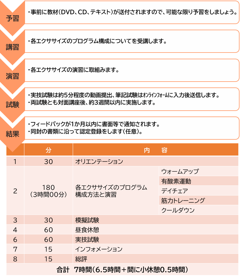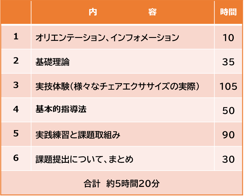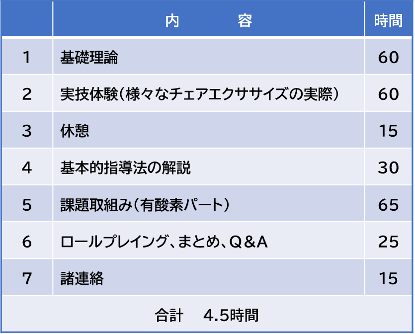 【内 容】目的別・強度別チェアエクササイズ体験/指導指針/チェアエクササイズのエビデンス/主運動の指導練習/修了確認
