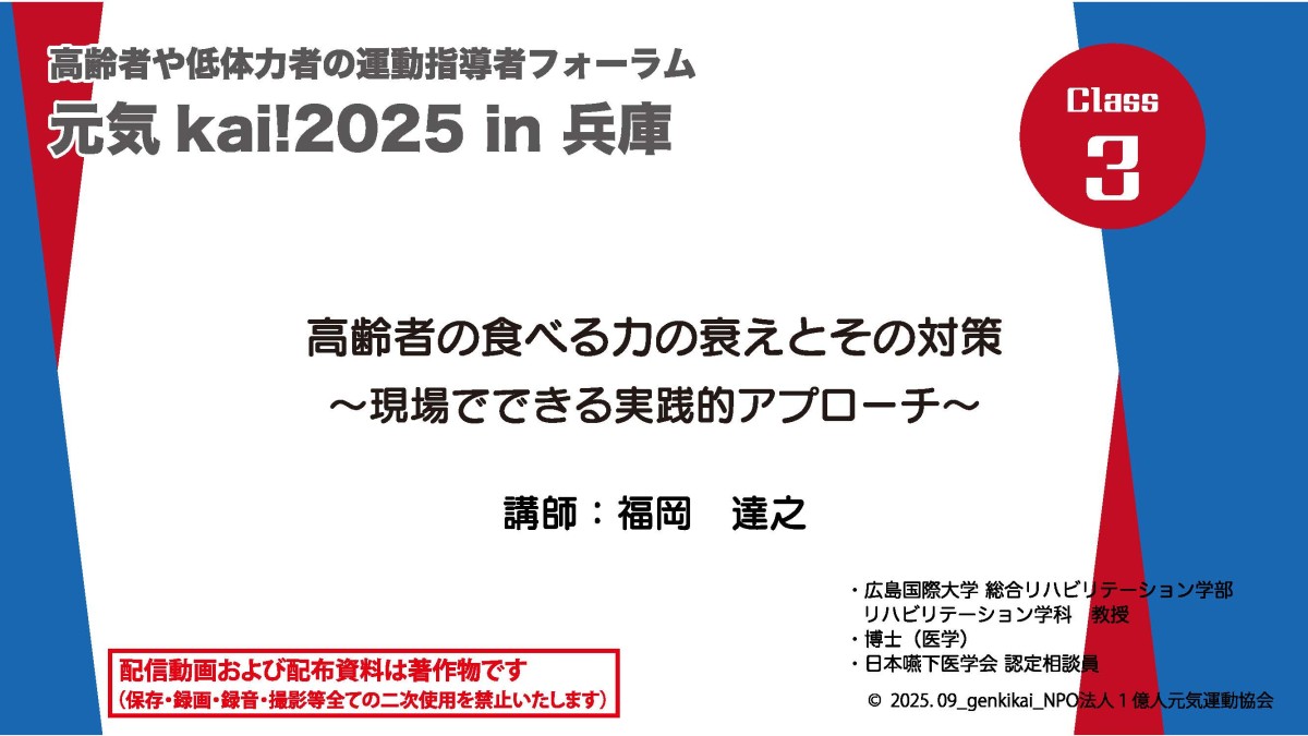 1億人元気運動協会 TOP > 講習会 > 元気kai! > 元気kai!0225オンライン資料クラス3 元気kai!0225オンライン資料クラス3 元気kai!レジュメ クラス2 講師:福岡 達之 高齢者の食べる力の衰えとその対策 ~現場でできる実践的アプローチ~ 資料
