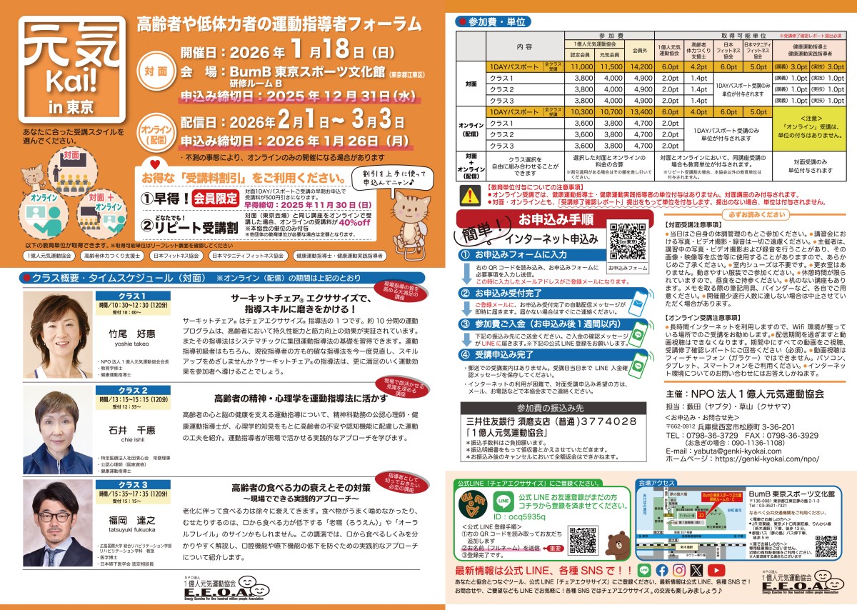 1億人元気運動協会 TOP > 講習会 > 元気kai! > 元気kai!リーフレット 元気kai!リーフレット ☆元気kai!は教育単位研修会です。取得できる単位についてはリーフレットをご覧ください。 PDFダウンロードはこちら
