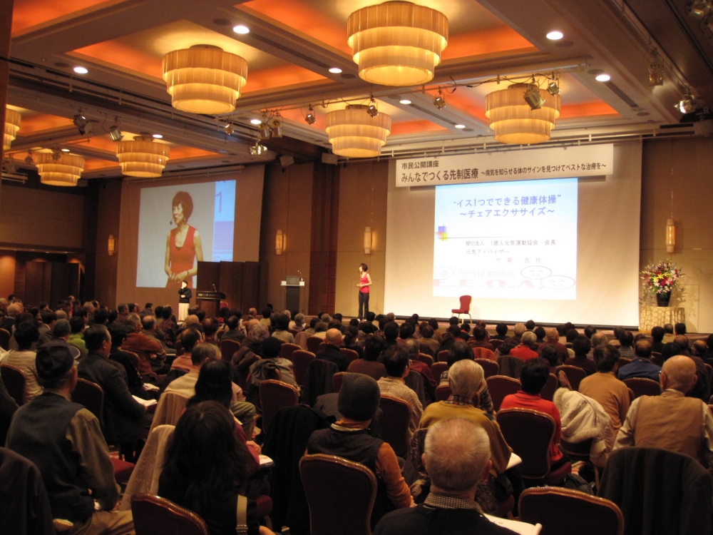 先端医療に従事される医師の3名の先生方が先に学術的見識からご講演後、最後が私の担当です。参加者は90分程度、同じ姿勢で講演を聞いていらっしゃったので、なるべく実践中心に「すぐにやってみよう!」と思っていただけるよう、記憶が困難でないわかりやすいエクササイズと講話に45分徹するようにしました。