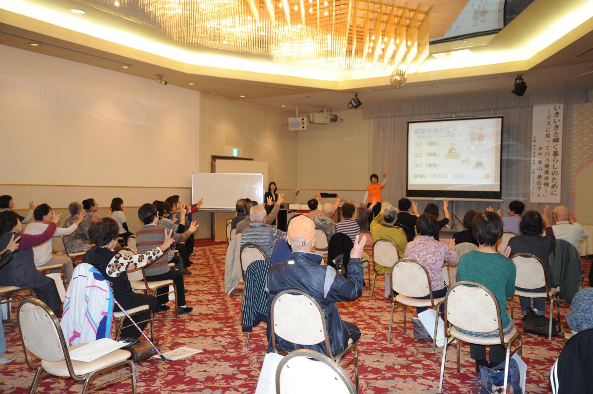 40名ほどお集まりの参加者は、タイトルに「健康体操」とあるので、運動をしやすい服装や靴でお越しの方が多く、健康づくりにも積極的な様子が感じられました。